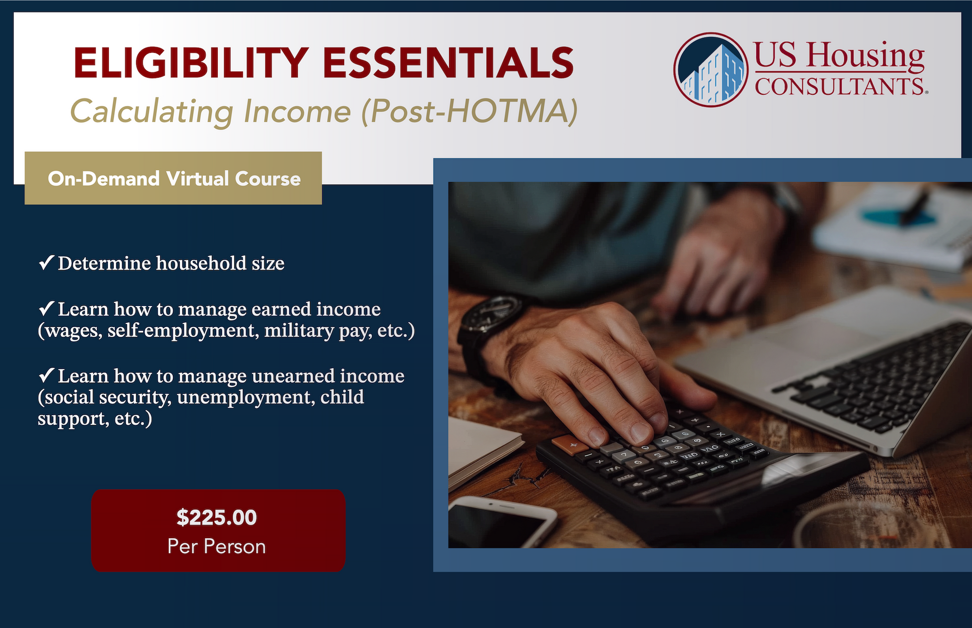 In this two-hour presentation, US Housing Consultant will provide an in-depth review of income calculation under HOTMA. This session will cover both the changes introduced by HOTMA and offer a refresher on how to calculate common income sources that remain unaffected by these changes.